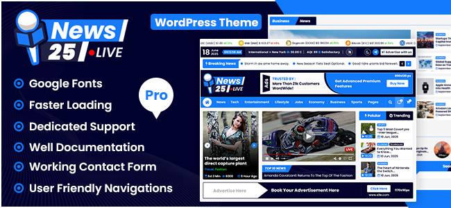 News25 Live is a professional WordPress theme designed for news, blogs, and online magazines. It features multiple header layouts, unique post styles, and category designs that give your site the look and feel of a real news company. The theme is fully responsive, optimized for mobile and small devices, and offers both dark and light modes for enhanced readability. Perfect for editors, journalists, and publishers who want a clean, fast, and engaging news website.